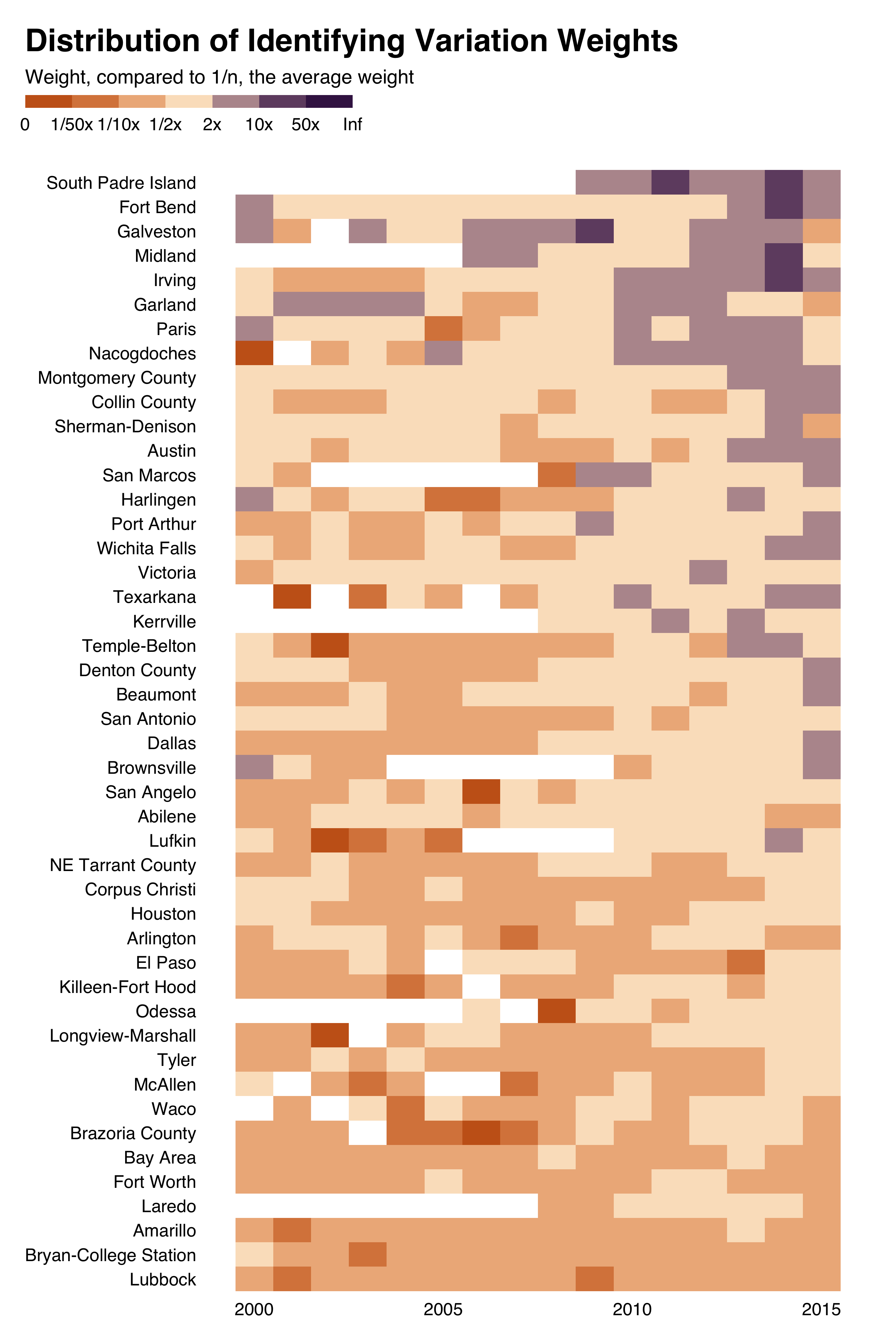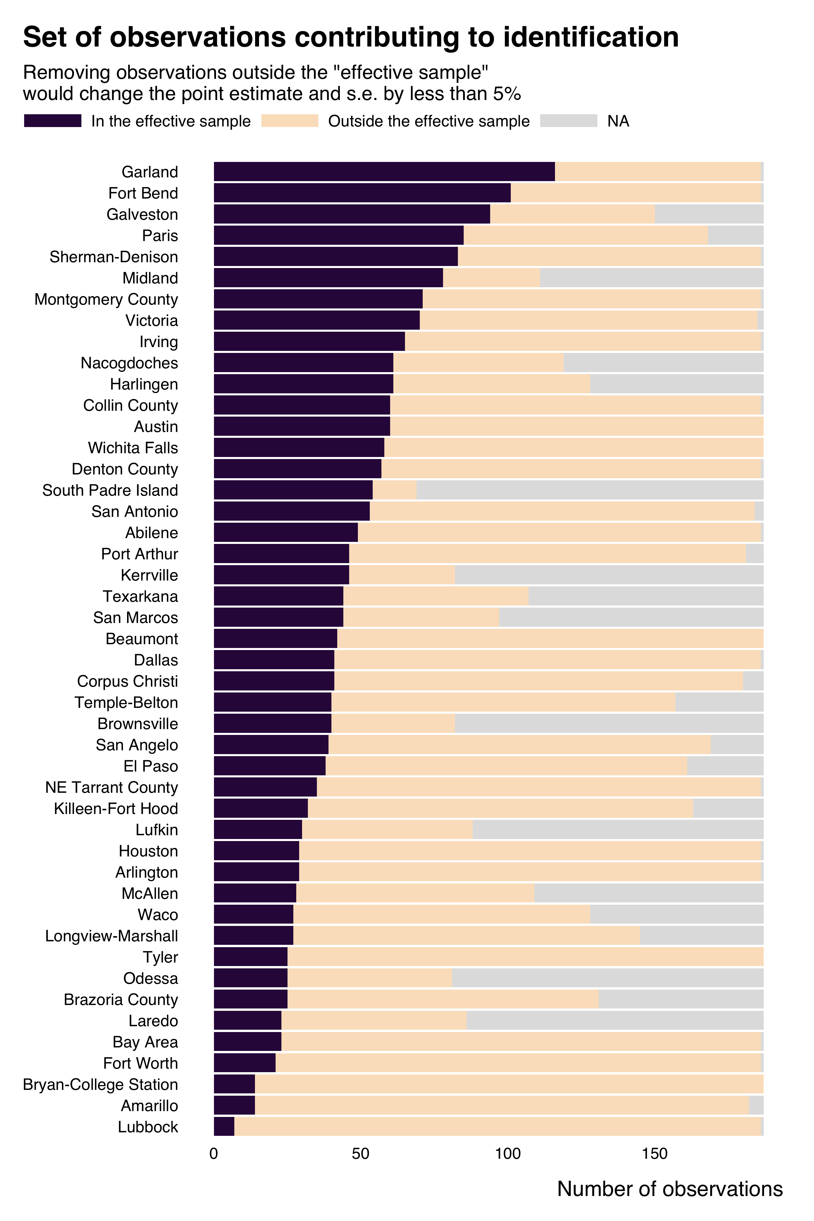 In this particular (somehow silly) regression, most of the identifying variation comes from a few cities: Houston, Dallas, Austin and San Antonio.