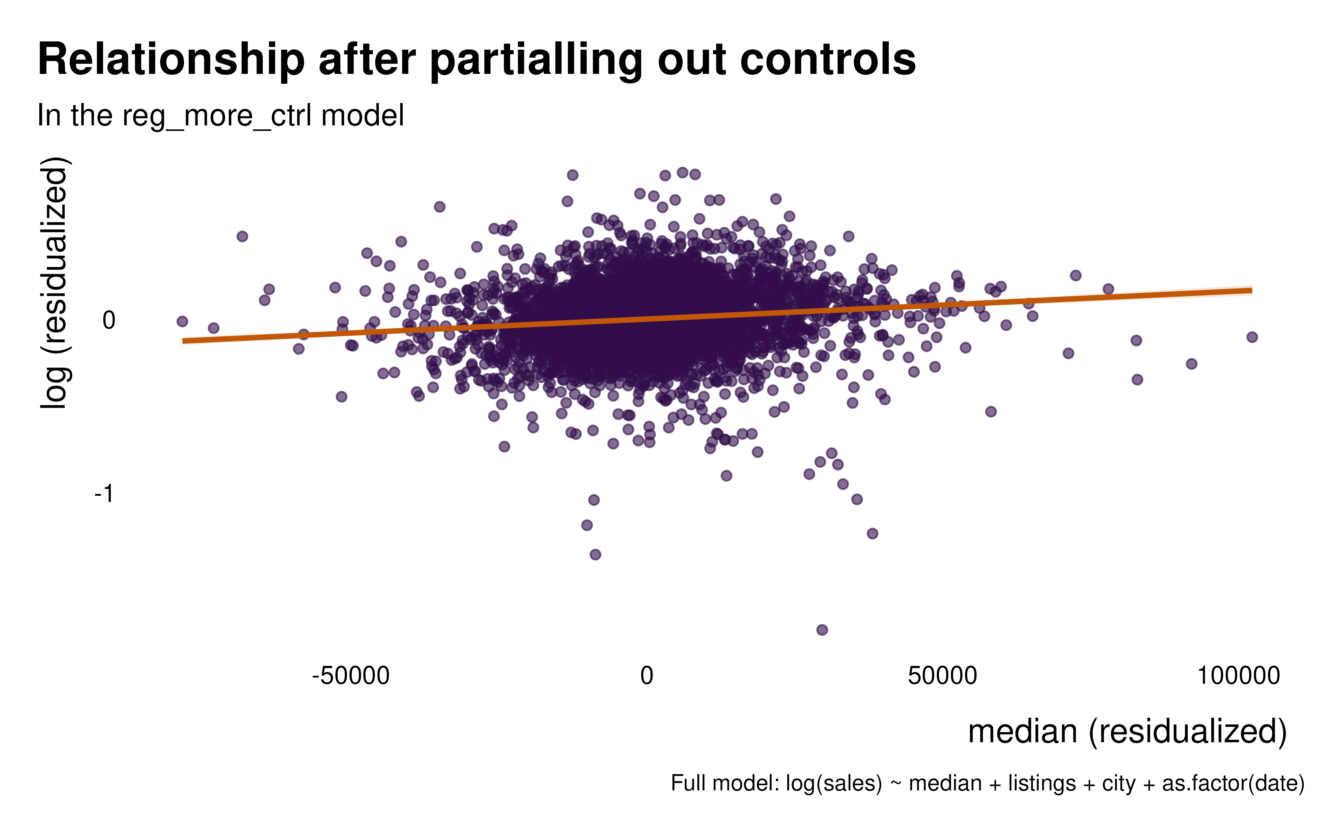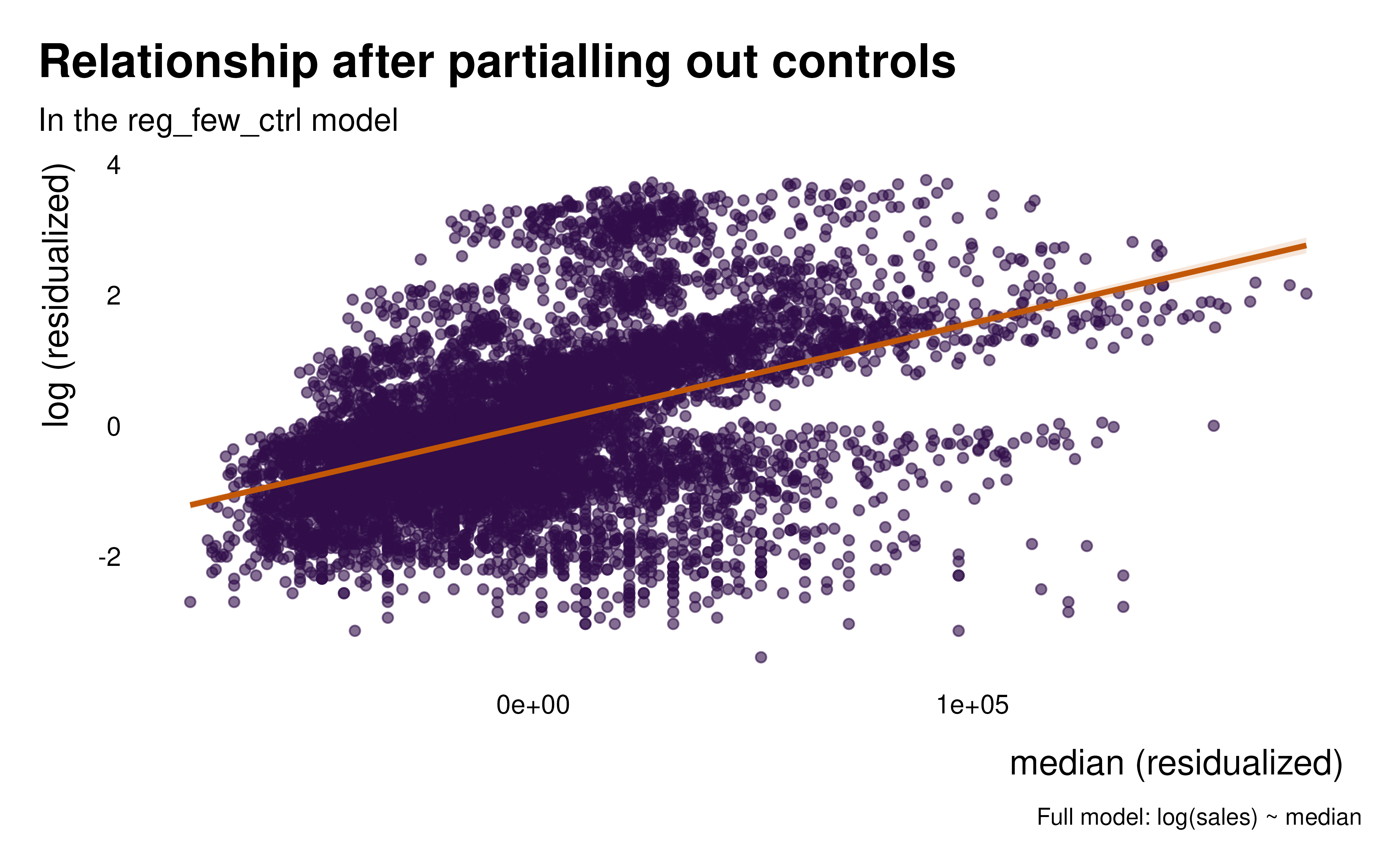 A ggplot2 scatter plot and regression line of the relationship between the outcome and the variable of interest, after partialling out controls.